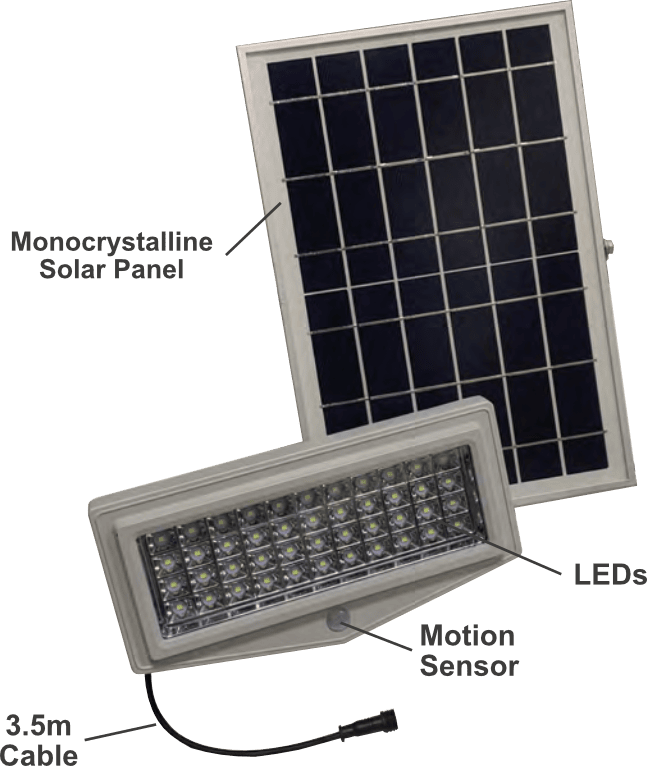 Triggered by motion, the SOLANERO brightens on approach and stays bright until no motion is detected for 30 seconds. Ideal for bin areas, public toilets, entrance & side access gates. Attaches to wall structures at approximately 3m high.