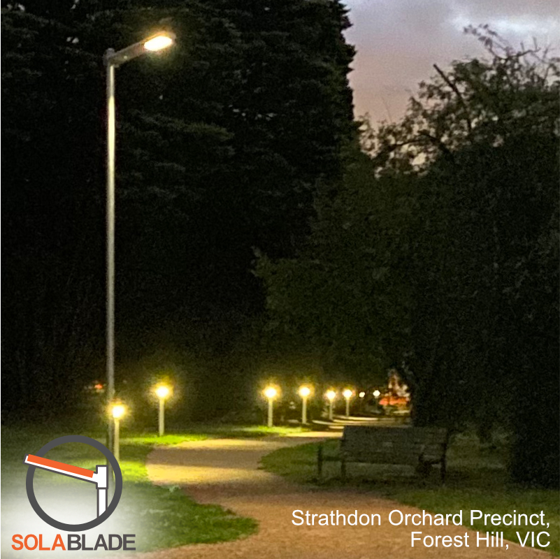 The Strathdon Orchard precinct required about 300m of pathway to be lit to AS/NZS pedestrian category compliance lighting. Because of moderate to heavy shading along the path from buildings and trees, a mix of overhead solar (SOLABLADE) and 1m high solar bollard lighting (SOLABOLLARD) was specified to achieve the lighting objective. To achieve compliance for the pathways, HIGHLUX specified: