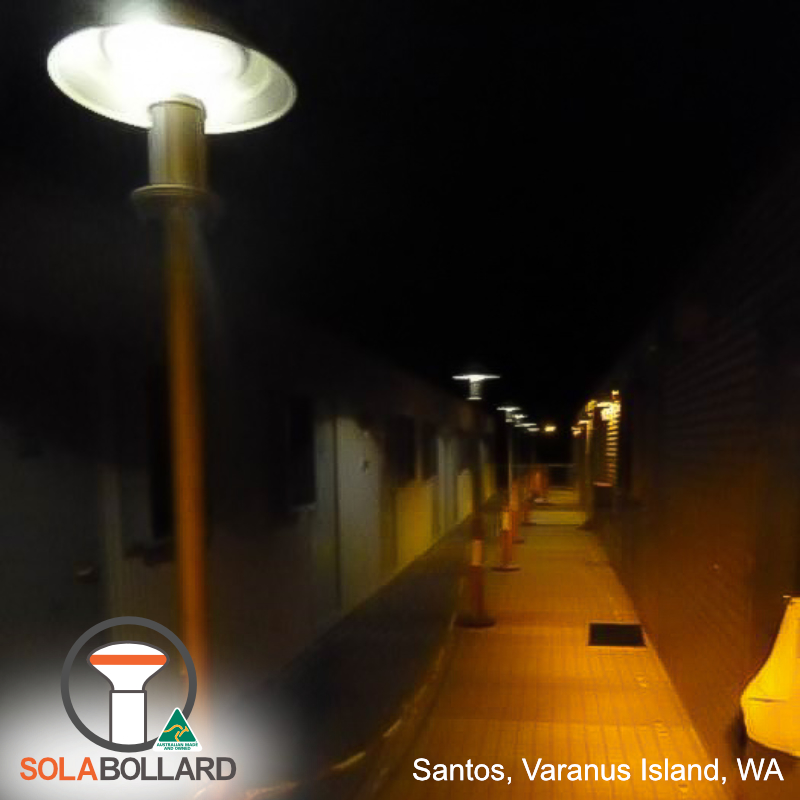 The photo above of the Varanus Island site is a daylight photo of the 3m high Solar Bollard Gen 2 with reflector. Not an award-winning photo, but you can see the lights around the perimeter of the narrow walking path of the top floor building. Out on Varanus, wind load is a consideration, as is light spill/pollution, and achieving pedestrian compliance lighting standards.